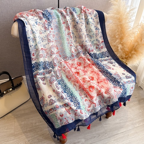 Algodón Lino Retro Patchwork Bohemio Estampado Seda Bufanda Chal Protector Solar Simple Temperamento Colgando Barbas Bufanda Larga para Viajes